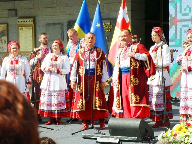 Волинський державний академічний український народний хор виступив у першому відділі концерту, відкривши його славнозвісною “Піснею про Волинь” Анатолія Пашкевича на вірші Дмитра Луценка, хоча якщо бути точним, ця пісня була у виконанні хору… другою, позаяк першою прозвучала “Молитва за Україну” Миколи Лисенка на вірші Олександра Кониського – на завершення урочистої академії до 935-річчя Луцька. І далі концерт пішов, як часто буває у цього колективу, безперервником, у якому артисти представили давно знані й улюблені шанувальниками Волинського народного хору пісні “Гарний козак, гарний” Петра Свіста на вірші Олеся Жолдака (солісти – заслужені артисти України Петро Хемій та Ярослав Дричик), “Прощай, мила Україно”, написана керівником хору Олександром Стадником на народні слова, “Була колись дівчина” (музика і слова Левка Лепкого, солісти – Артем Мартинович та Дмитро Савчук), “Отаман” (музика і слова Ігоря Семендяєва, солісти – заслужений артист України Петро Хемій та Дмитро Савчук), українські народні пісні в обробці Олександра Стадника “Ой у лузі при дорозі” (солісти – Іван Місанчук та Тетяна Клекочко), “Тиха вода” (соліст – Владислав Карпов), “Їхав козак за Дунай”, “Коли калина розцвіла” (обробка Олександра Стадника-старшого, солісти – Юрій Литвинюк та Марія Табачук). Вокальні номери вдало перепліталися з іскрометними танцювальними композиціями “Волинь моя”, “Козачок”, “Гупали”, “Козаки йдуть – Гопак”. Словом – атмосферу свята і власне хор, і оркестр, і балет створили якнайповнішу, й закономірним продовженням та кульмінацією її стало друге відділення, у якому присутні зустрілися з легендарною постаттю української естради ‒ Героєм України, лауреатом Шевченківської премії, народним артистом України, почесним громадянином Луцька Василем Зінкевичем.