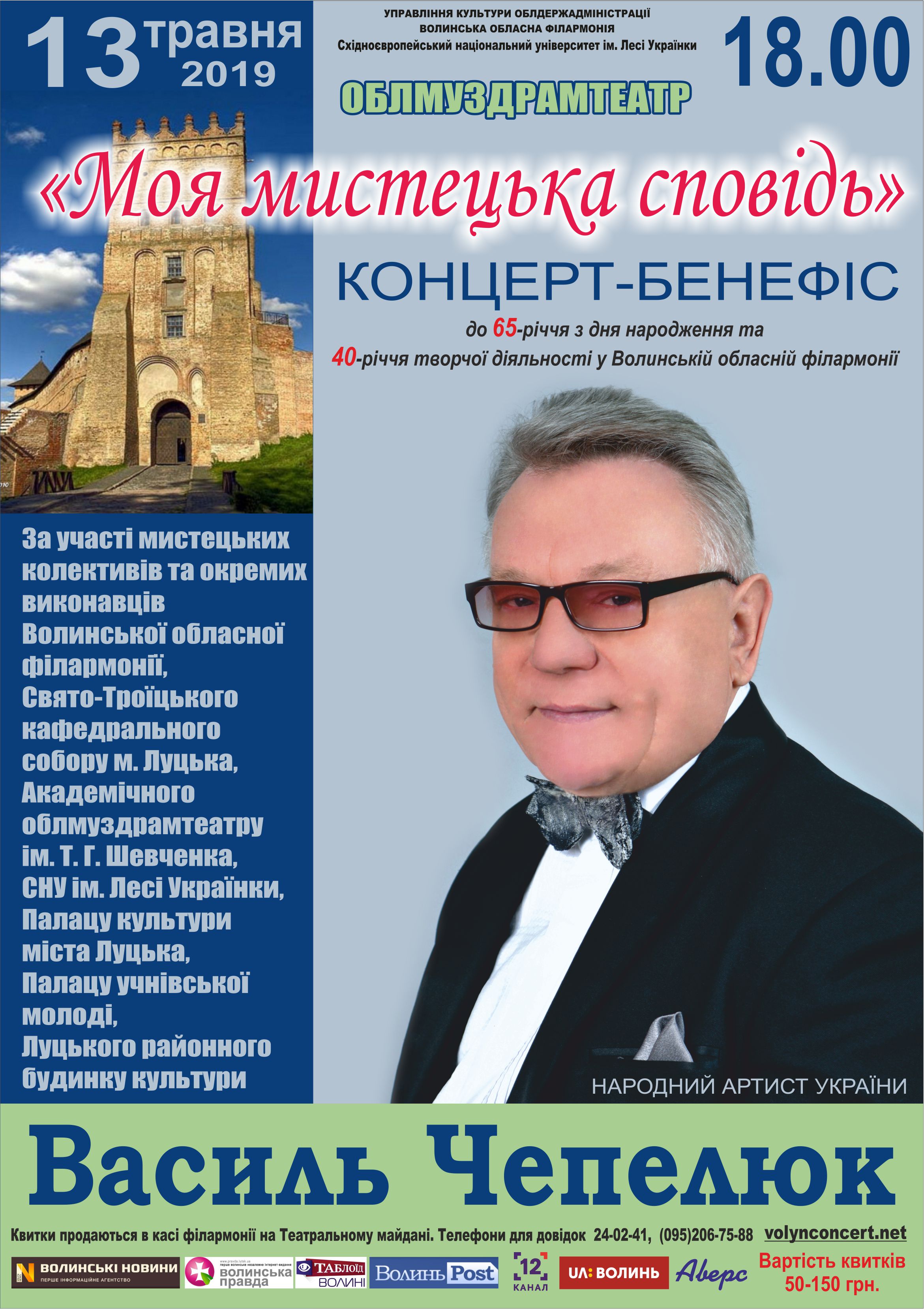 Шанувальників таланту народного артиста України, професора Східноєвропейського національного університету імені Лесі Українки Василя Чепелюка запрошуємо на його концерт-бенефіс “Моя мистецька сповідь”, присвячений 65-річчю від дня народження та 40-річчю творчої діяльності співака у Волинській обласній філармонії.