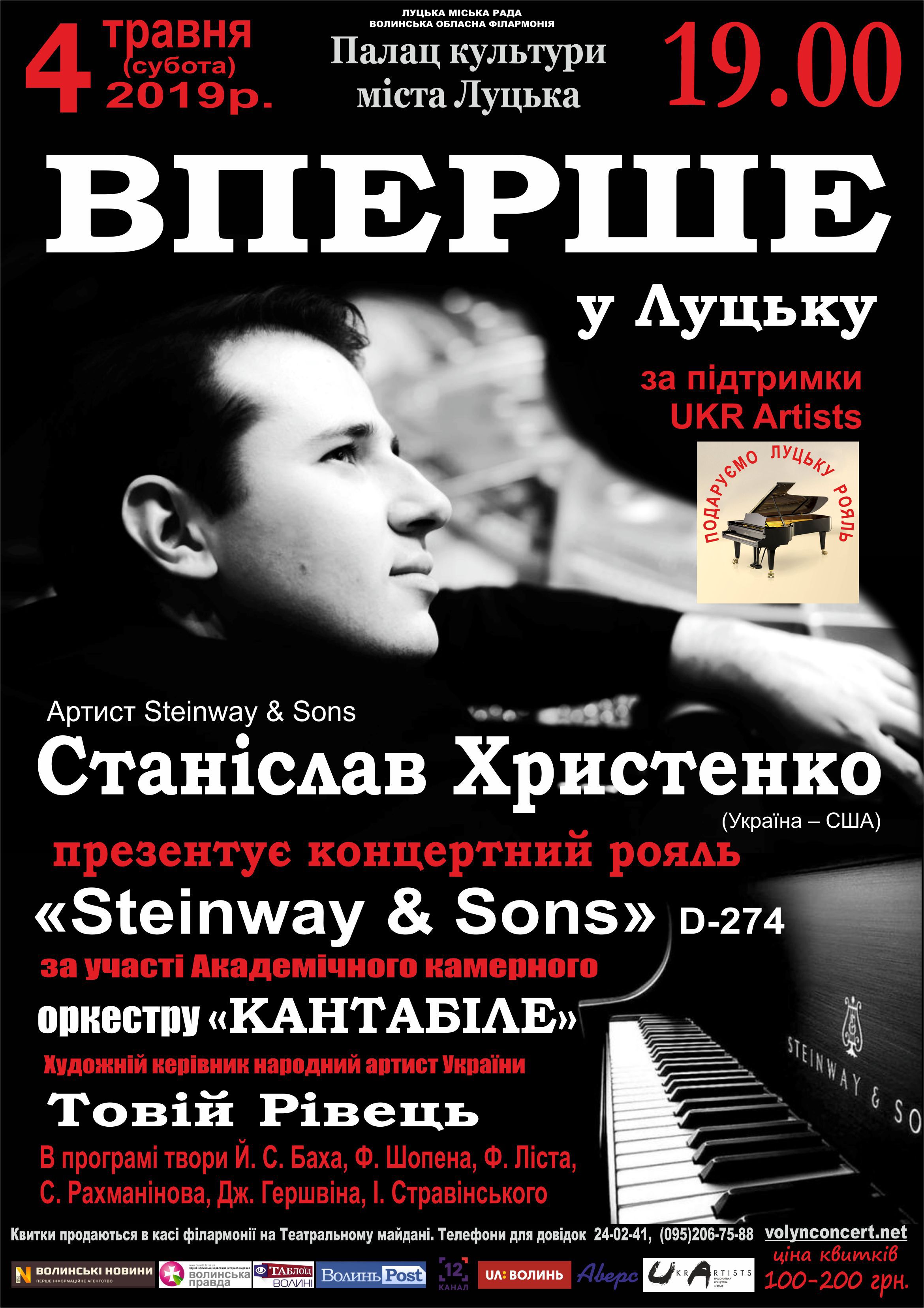 Мешканці і гості міста матимуть чудову нагоду почути неповторне звучання цього унікального інструмента. Представить його артист “Steinway & Sons” – відомий український піаніст і диригент Станіслав Христенко.