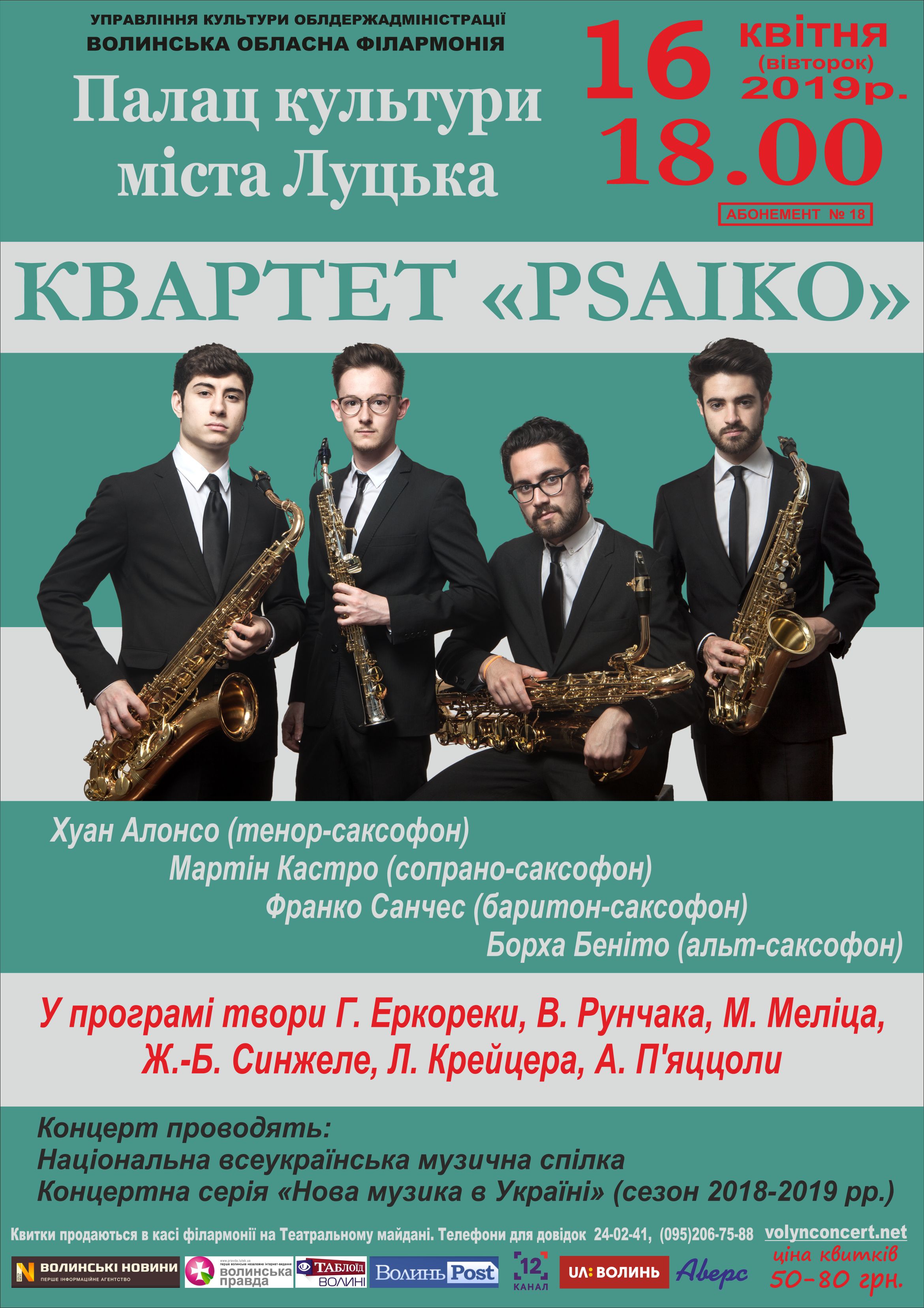 Передбаченням нерідко властиво збуватися. І, ясна річ, особливо приємно, коли збуваються саме добрі передбачення – як-от, скажімо, недавній прогноз щодо квітня, щедрого на концертні події в Луцьку. 16 квітня Волинська обласна філармонія запрошує любителів справжньої музики до Палацу культури міста Луцька – послухати виступ квартету саксофоністів “Psaiko” (Іспанія) у складі Хуана Алонсо (тенор-саксофон), Мартіна Кастро (сопрано-саксофон), Франко Санчеса (баритон-саксофон), Борхи Беніто (альт-саксофон).