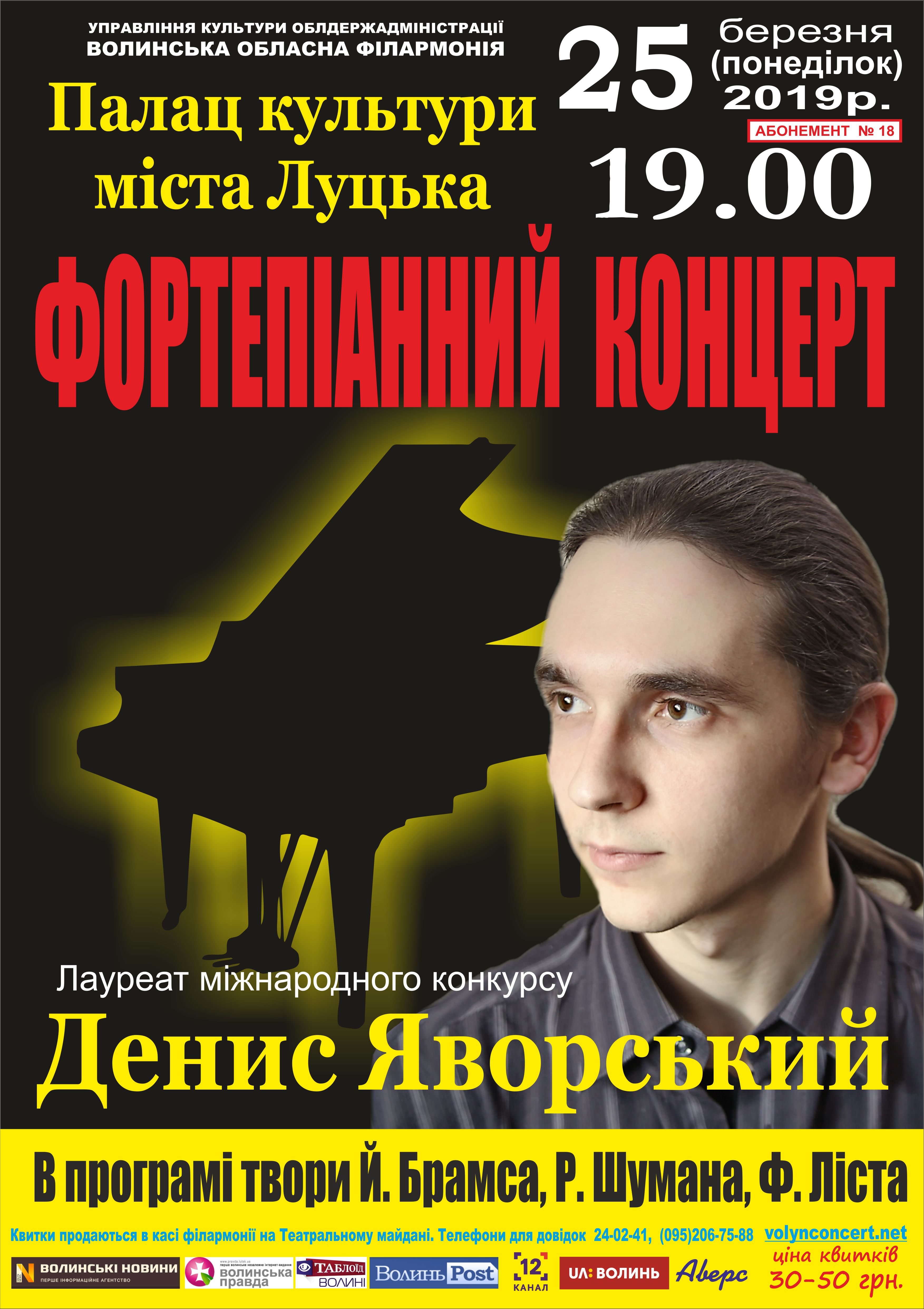 У понеділок, 25 березня, Денис Яворський дасть концерт у Палаці культури міста Луцька. У програмі твори Йоганнеса Брамса, Роберта Шумана, Ференца Ліста.