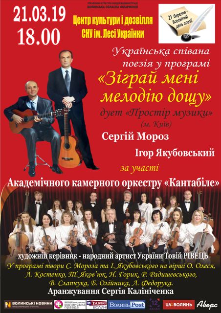 До Всесвітнього дня поезії (21 березня) дует «Простір музики» (м.Київ) і Академічний камерний оркестр «Кантабіле» Волинської обласної філармонії пропонують волинянам програму «Зіграй мені мелодію дощу». 20 березня о 15-й годині концерт відбудеться у Нововолинську (Центр художньої і технічної творчості), а 21 березня о 18-й годині у Східноєвропейському національному університеті імені Лесі Українки (Центр культури і дозвілля на вул. Винниченка, 30).