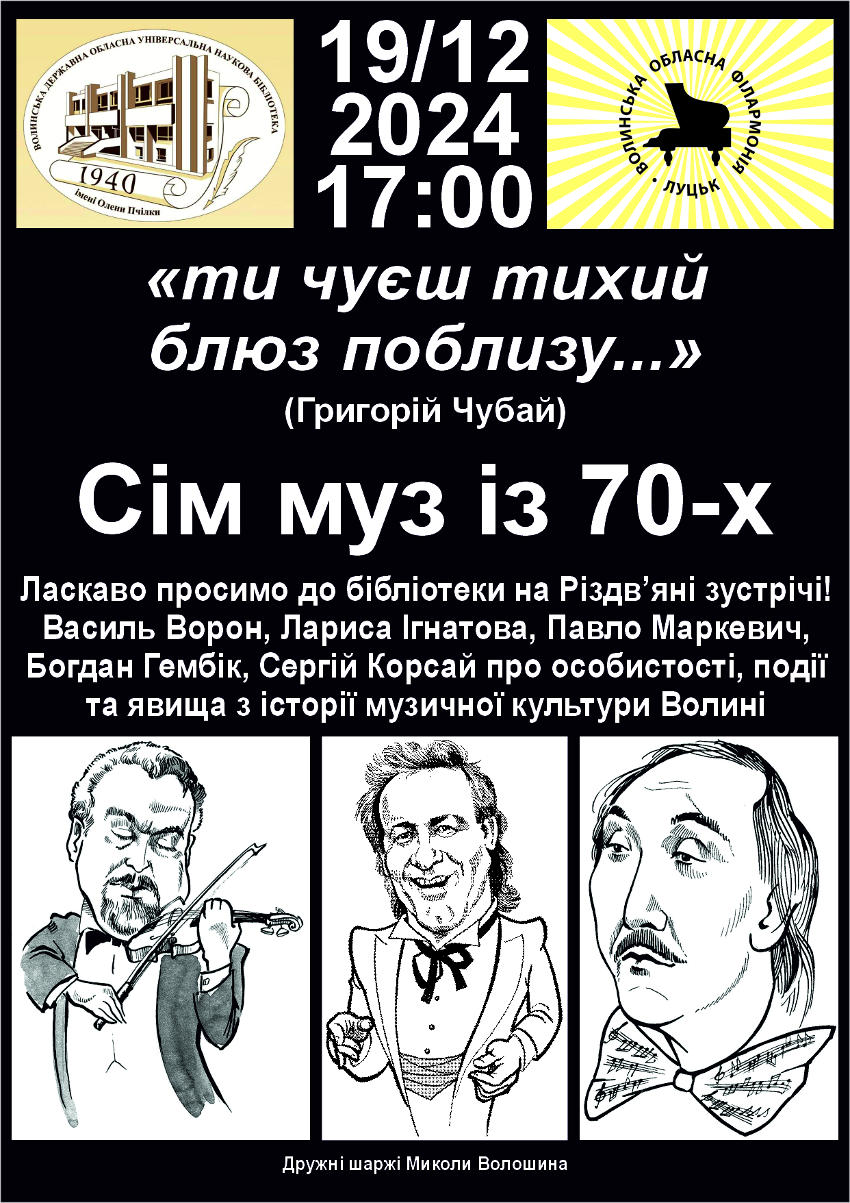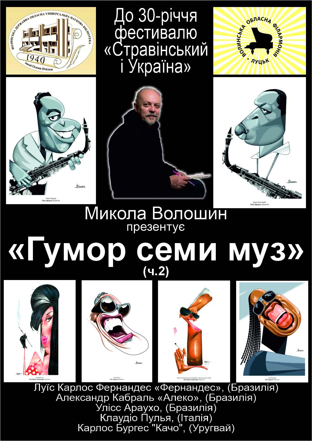 Дякуємо Миколі Волошину за чудовий презент до 30-річчя фестивалю «Стравінський та Україна», виставку дружніх шаржів "Гумор семи муз", тріо "Бумеранг" Богдана Гембіка за простоту, почуття і стриманість, директору бібліотеки Наталі Граніч за гостинність.