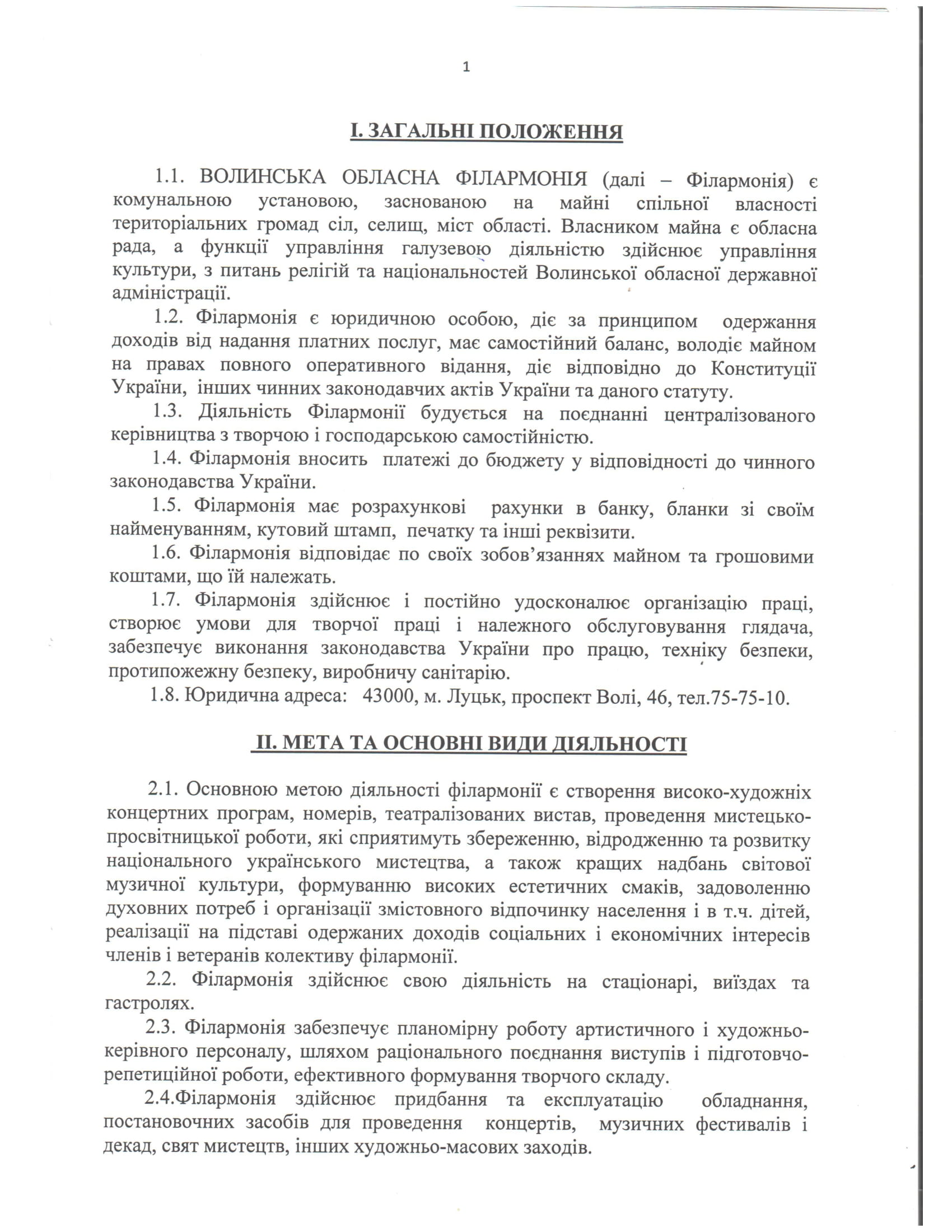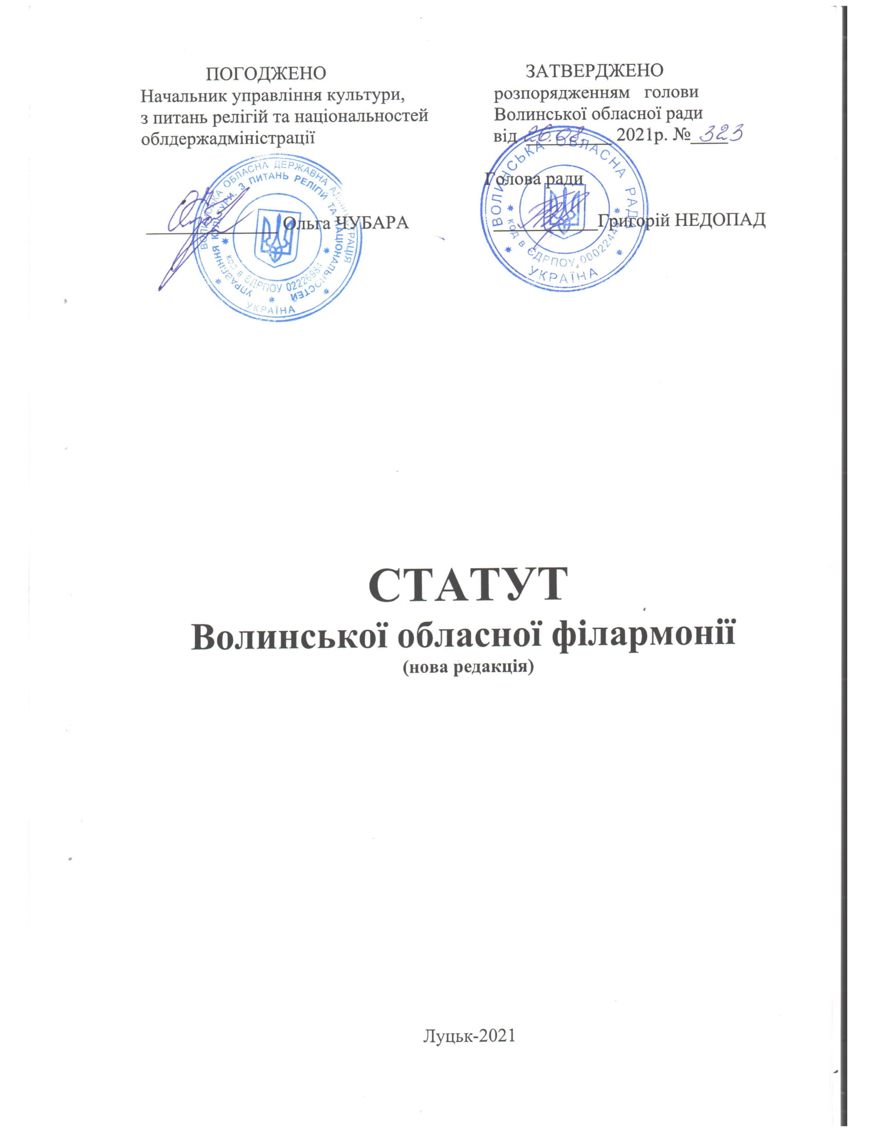 Статут Волинська обласна філармонія (нова редакція) №323 від 26.08.2021 року